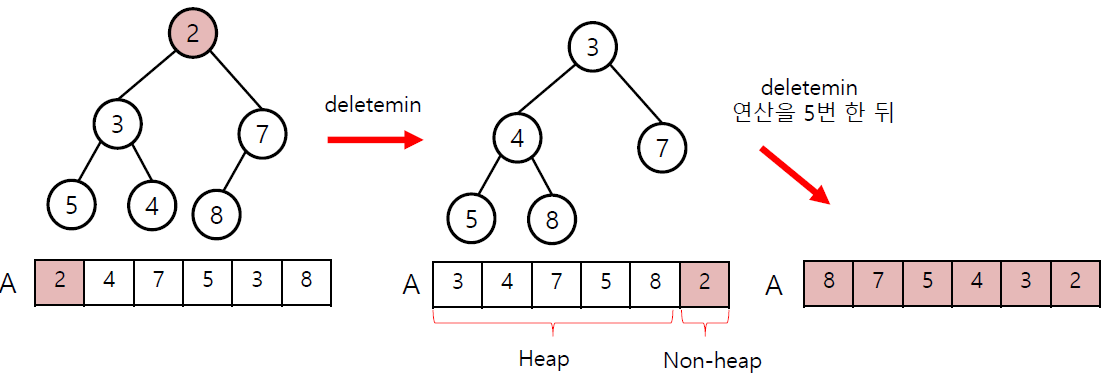 하지만 Heapify 연산을 이용하면, 추가 array를 생성하지 않고서도 정렬 가능하다