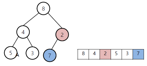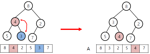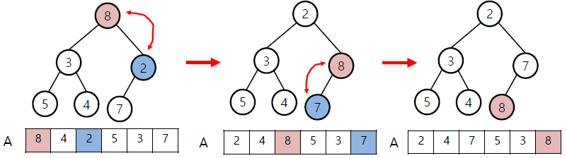 왼: 다음 node인 4와 child중 작은 node인 3 비교 후 swap / 오: 8과 2 swap, 8과 7 swap