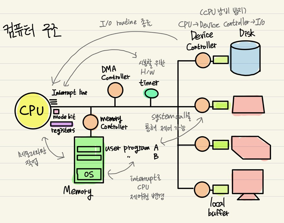 컴퓨터의 구조를 나타내는 그림이다. CPU는 메모리와만 작업을 하고, 메모리는 OS 및 user program의 데이터들을 저장하고 있다. user process간에는 인터럽트를 통해 cpu의 제어권을 넘겨받는다.