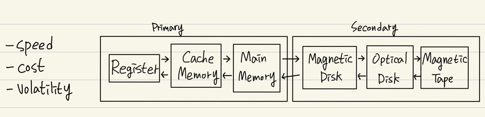 - DMA Controller: I/O Device의 특성상, 입출력이 비정기적으로 자주 발생할 수 있다. CPU가 인터럽트를 자주 당하게 되면 원래 하던 작업을 제대로 완수하지 못 하기 때문에, 이것을 방지하기 위한 보조 장치이다. CPU의 중재 없이 Device Controller가 Buffer storage의 내용을 메모리에 직접 전송하는 것을 돕는다.