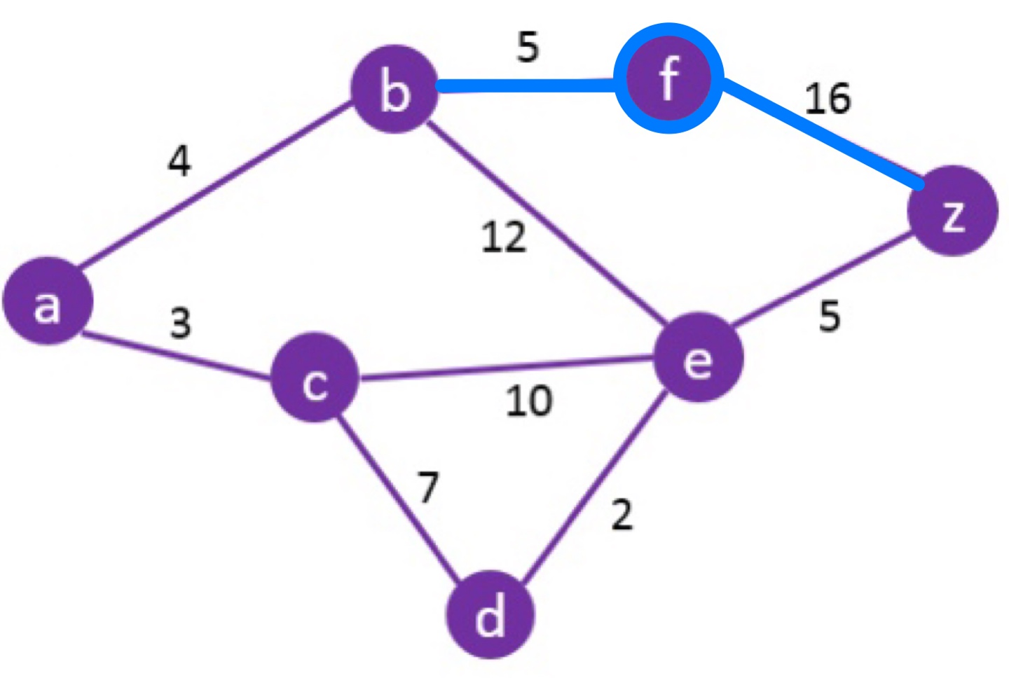 Vertex vertex u에서 해당 vertex까지 shortest path의 길이 vertex 방문 여부 f 0 X b 5 = min of ∞ and 0+5 X z 16 X ... ∞ X N ∞ X 위의 그래프에서는 시작 vertex f와 incident한 vertex b와 z에 대해 shortest path길이의 update가 발생했다.
