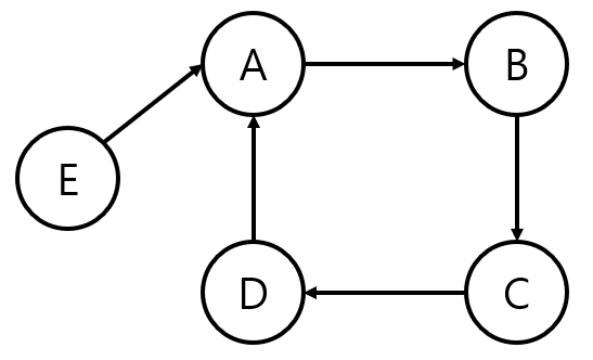 하지만 오른쪽 그래프는 E에서 A,B,C,D로의 path가 존재하지만 다른 정점에서 E로 가는 path가 존재하지 않기 때문에 strongly connected하지 않다.