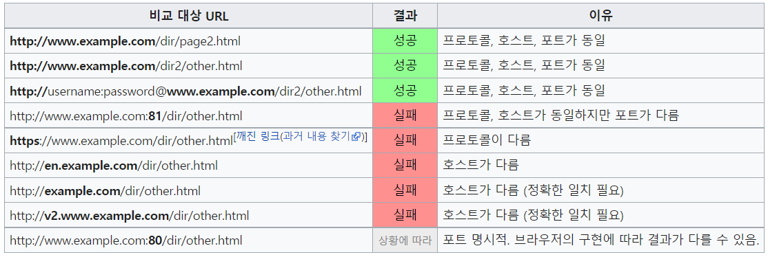 https://ko.wikipedia.org/wiki/%EB%8F%99%EC%9D%BC-%EC%B6%9C%EC%B2%98_%EC%A0%95%EC%B1%85 이러한 식으로 프로토콜, 호스트, 포트 중 하나라도 다르면 브라우저는 같은 출처라고 보지 않는다.