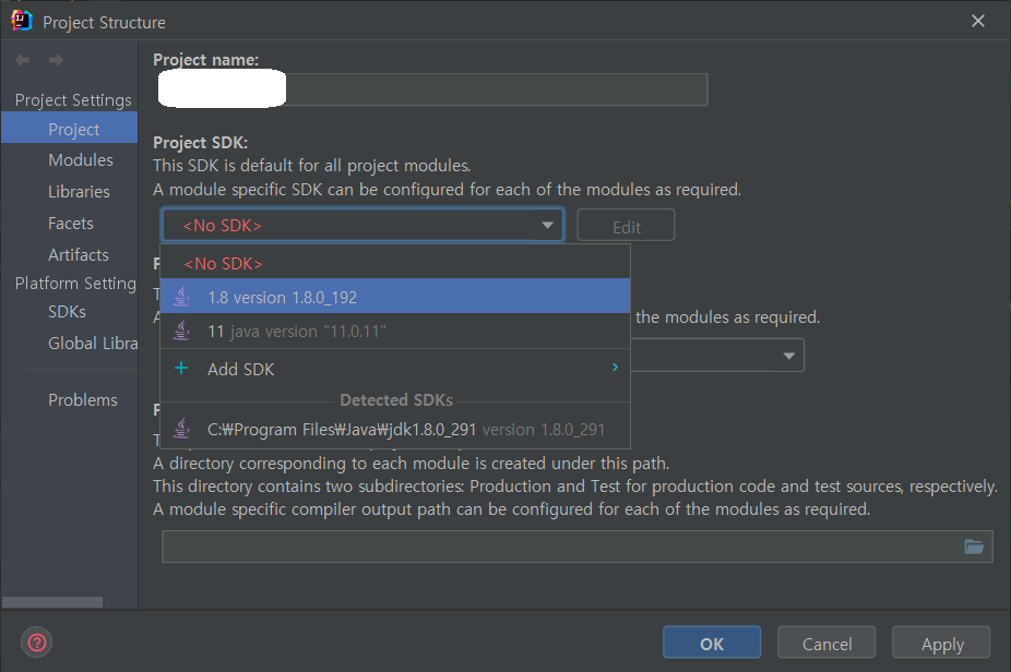 2. Project SDK를 자신이 사용하는 Java version에 맞게 선택해준다
