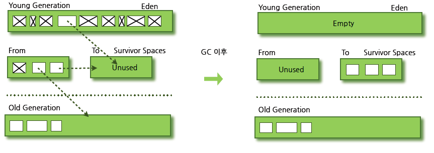 - 하나의 Survivor 영역이 가득 차게 되면 그 중 살아남은 객체를 다른 Survivor 영역으로 이동한 뒤 기존 Survivor 영역은 비움