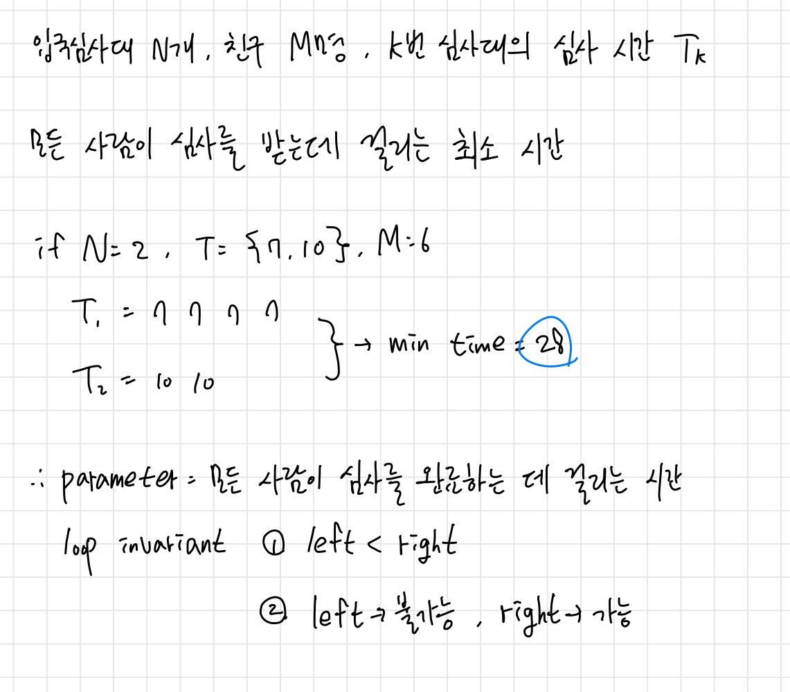 따라서 mid 값을 두어 해당 값일 때 모든 심사대에서 통과할 수 있는 사람 수를 카운트하고, 가능/불가능 여부로 다음 탐탐색 범위를 결정한다.