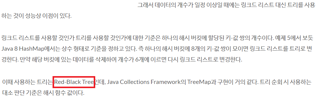 👉 Key값의 Collision이 발생할 경우 같은 Hash값을 가지는 원소들을 Collection으로 관리하는데, 이 때 원소의 개수가 많아지면 Red-Black 트리를 이용해서 관리하여 연산 시간을 O(log)으로 관리한다