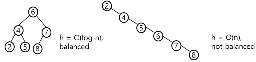 왼쪽 그림과 같이 완전 이진트리의 형태는 탐색 시간복잡도가 로그 시간이지만, 링크드리스트의 형태일 때 에는 선형 시간을 가질 수 있다.