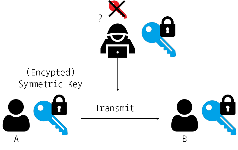 2️⃣ 송신자는 암호화된 대칭 키를 수신자에게 전송한다. 이 때, 암호화된 키는 수신자의 개인 키가 있어야만 복호화할 수 있기 때문에 전송 과정에서 탈취돼도 대칭 키의 정보는 유출되지 않는다.