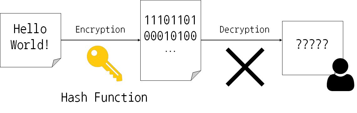 위의 두 암호화 알고리즘은 암호 키를 사용해서 평문을 암호문으로 암호화, 암호문을 평문으로 복호화할 수 있었다. 하지만 Cryptographic hash function(암호화 해시 함수)를 사용한 단방향 암호화 방식은 평문을 암호화한 뒤로는 복호화할 수 없는 암호화 방식이다.