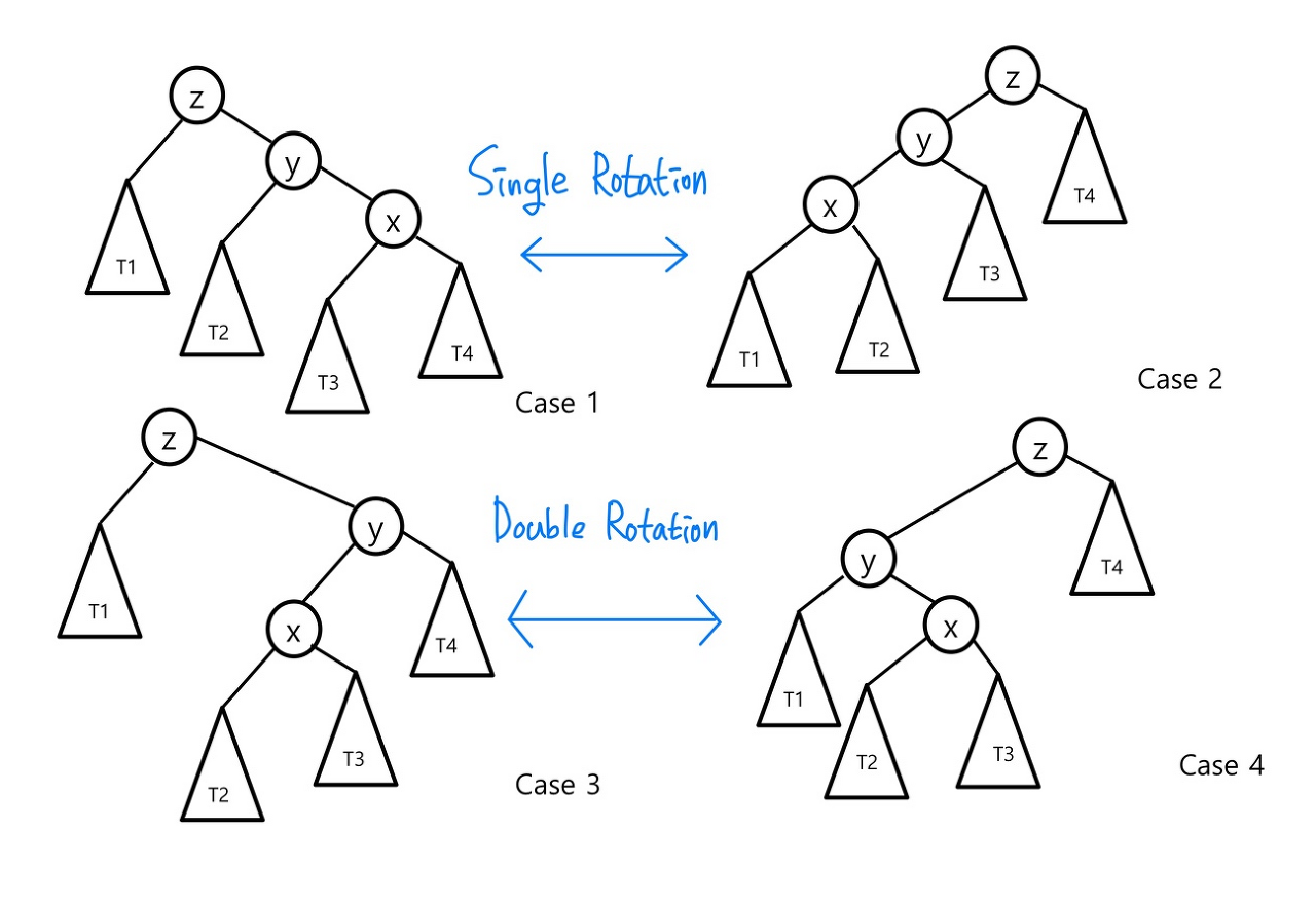 Case1 & 2의 경우에는 트리를 한 번 회전시키는 Single Rotation, 3 & 4의 경우에는 트리를 두 번 회전시키는 Double Rotation을 적용하면 Balanced Property를 만족할 수 있다.