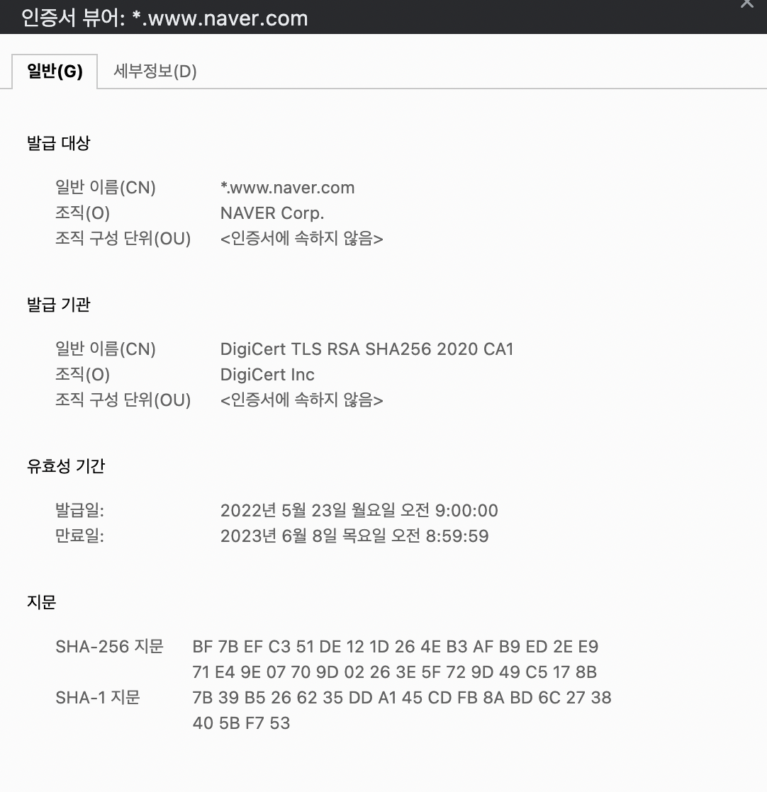 www.naver.com 에 접속하여 주소창의 자물쇠 버튼을 클릭하면 현재 https로 연결된 서버의 인증서 정보를 확인할 수 있다.