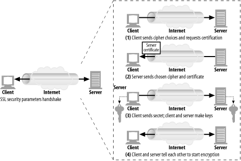 그리고 양쪽이 알고 있는 암호화 알고리즘으로 통신하기 위해, 클라이언트는 서버로 알고리즘 후보들을 보내는 동시에 서버의 인증서를 요구한다.