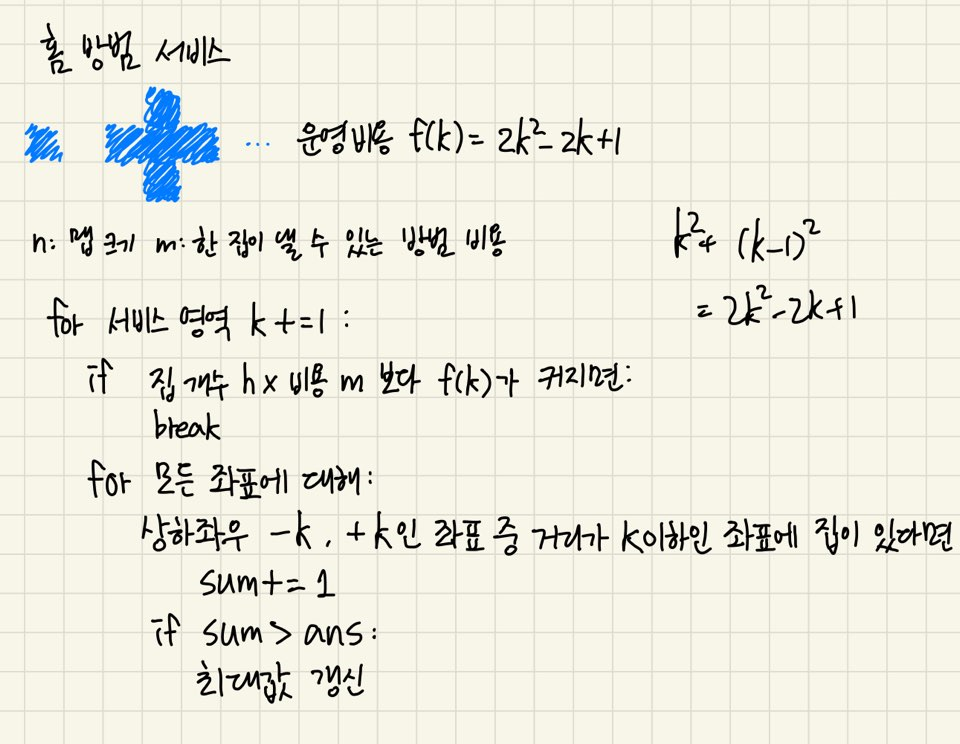 for문 내에서 거리가 K이하인 집들을 count해서 최대값을 계속 갱신해주면 끝